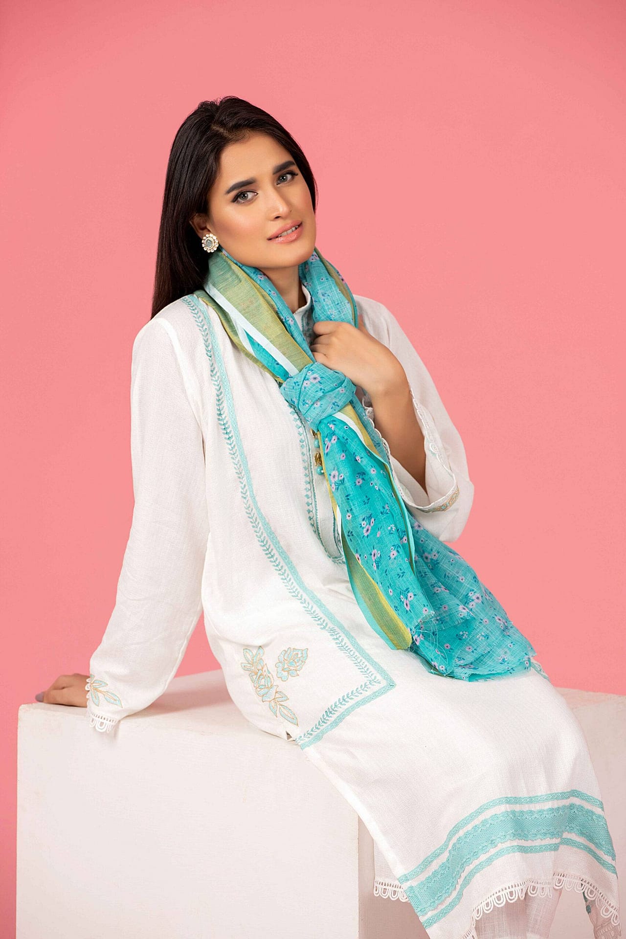 Sophisticated detailed white textured irish kurta. The collar band sleeves and side panels have intricate rose motif made of dori resham and zari. Front has combination of lace and blockprint. Gota and beads on front patti.