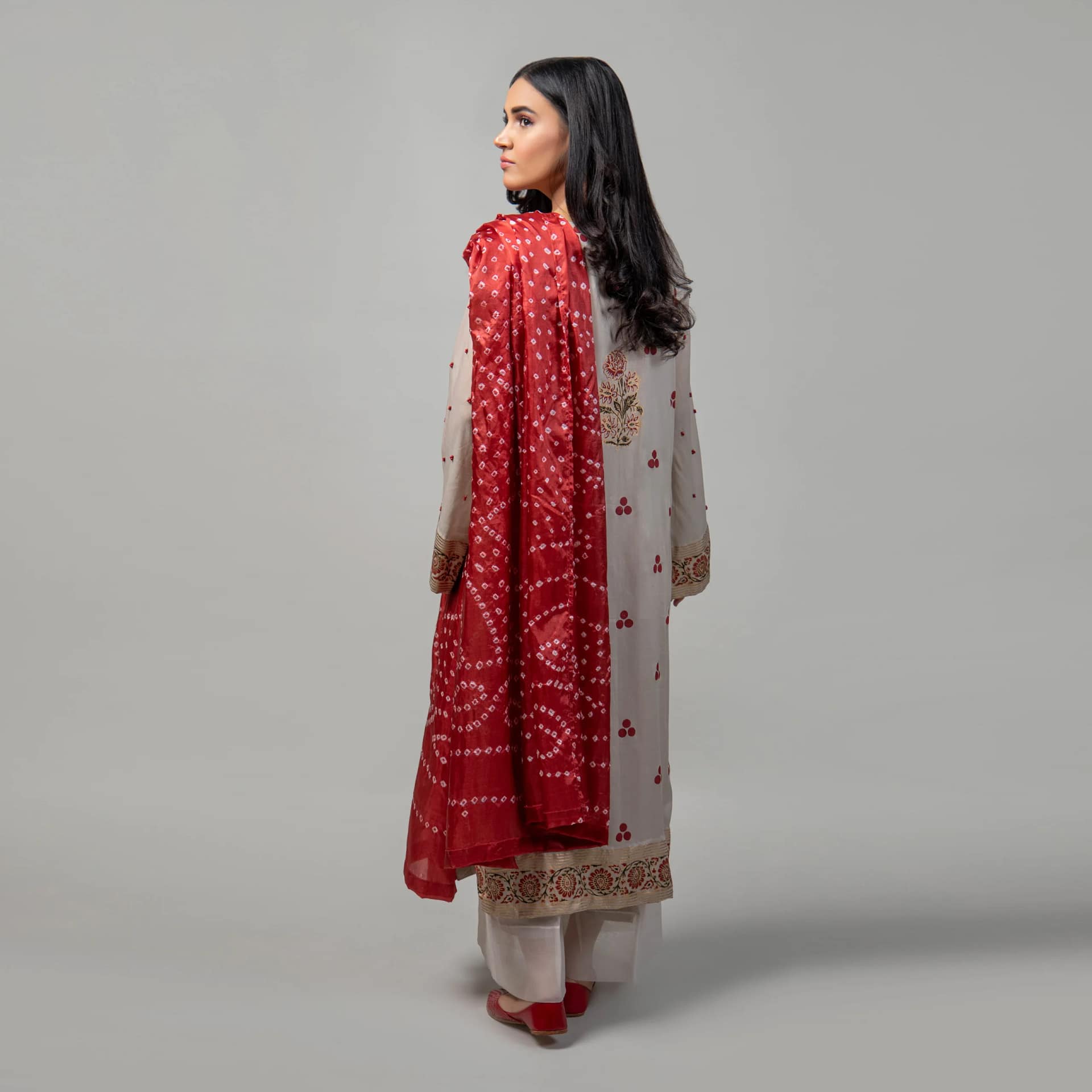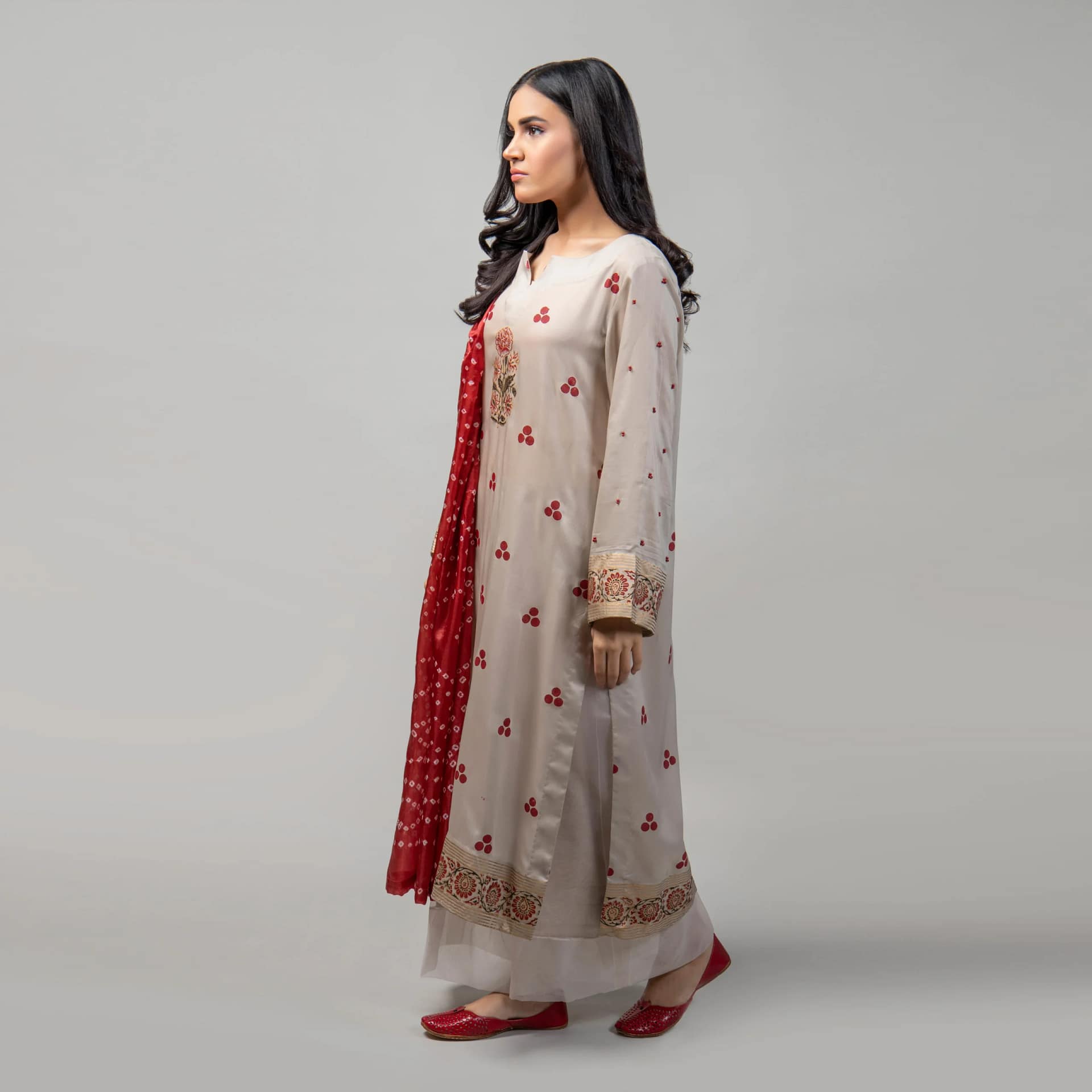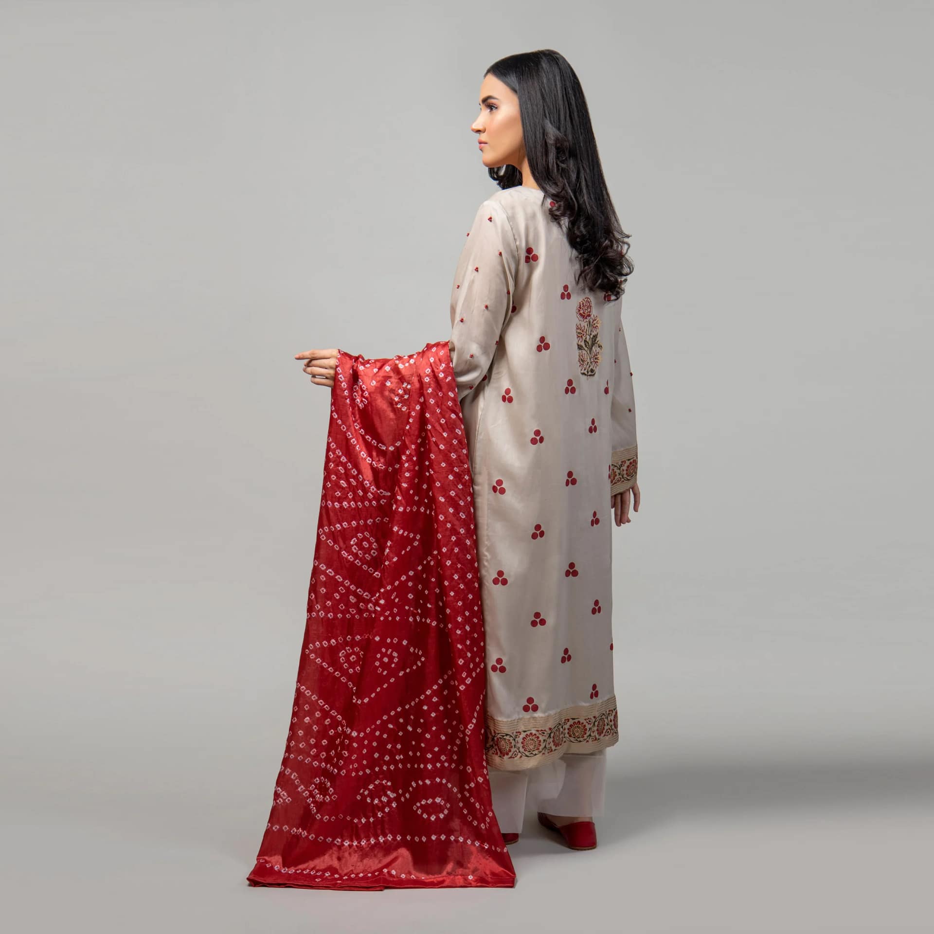 A long shirt with aesthetic signature 3 dot block printing, paired with wide legged trousers and Chundri duppatta.